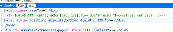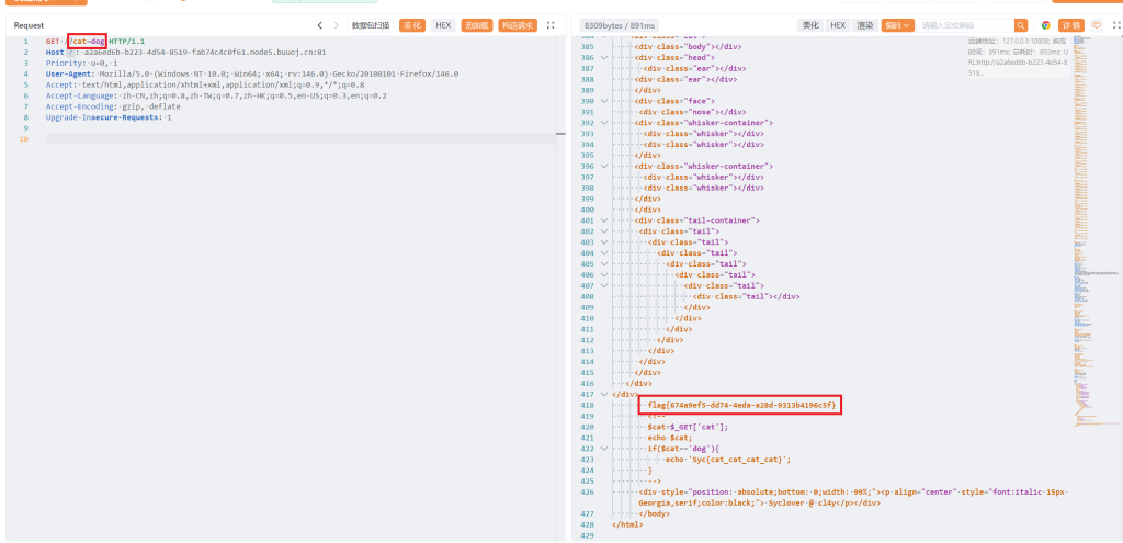 [极客大挑战 2019]Havefun 2026-1-15 11:10 | Web | 28 56 字 | 1 分钟内 [极客大挑战 2019]Havefun 1、题目一起来撸猫 2、f12看到body绿色写了输入cat=dog,得到cat_cat_cat_cat 3、在url中注入?/cat=dog,得到flag flag{674a9ef5-dd74-4eda-a28d-9313b4196c5f} 赞赏 BUUCTFWeb命令执行