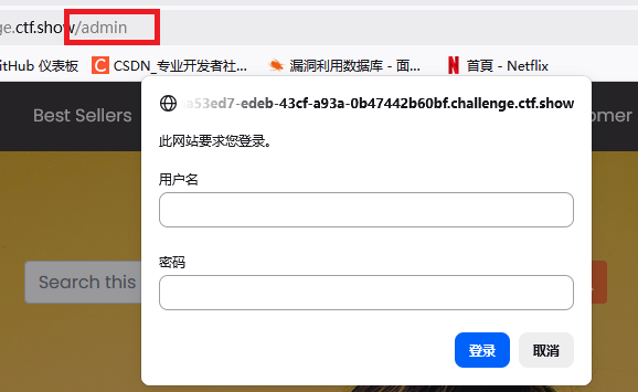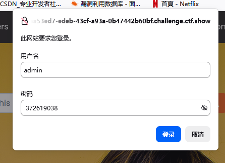 3、在url中插入admin,看到登入界面,用户名输入admin,密码输入在网页末尾看到的一串数字372619038,得到flag