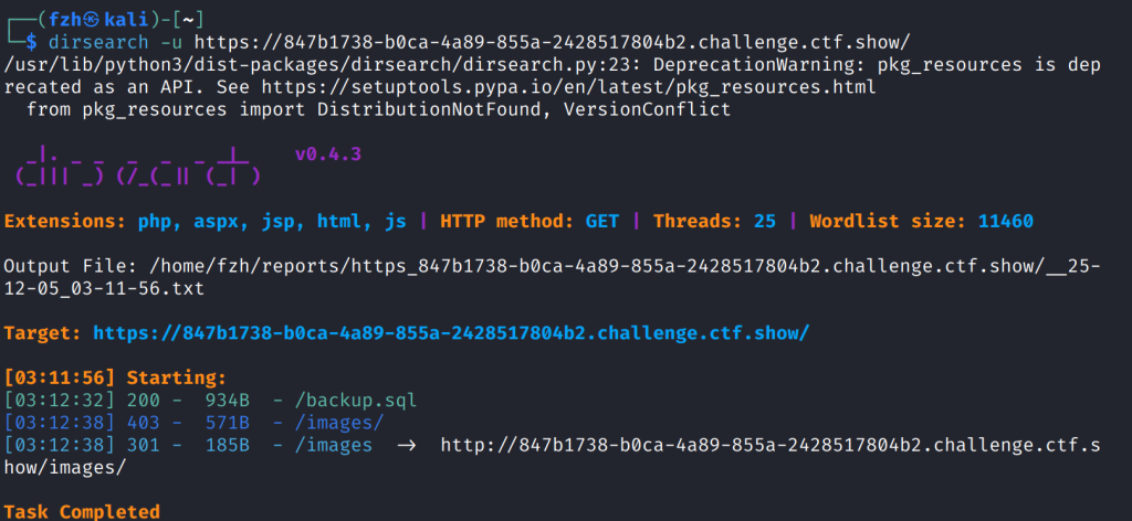1、看到给的题目:备份的sql文件会泄露敏感信息。刚开始没什么思路,我们可以先用dirsearch扫一下目录