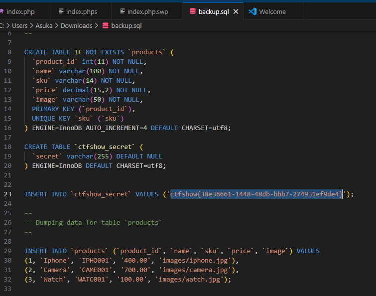 2、发现backup.sql,在url中插入backup.sql下载下来一个文件