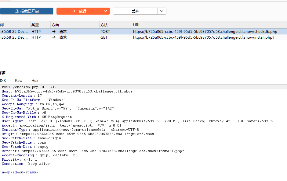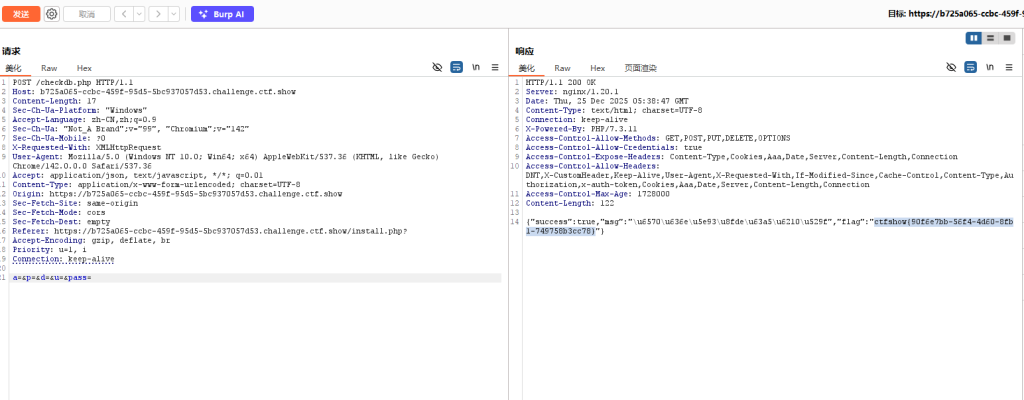 3、看到checkdb.php,这是进入数据库的地址,转发,看到最后一行,flag在里面