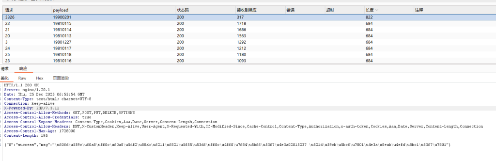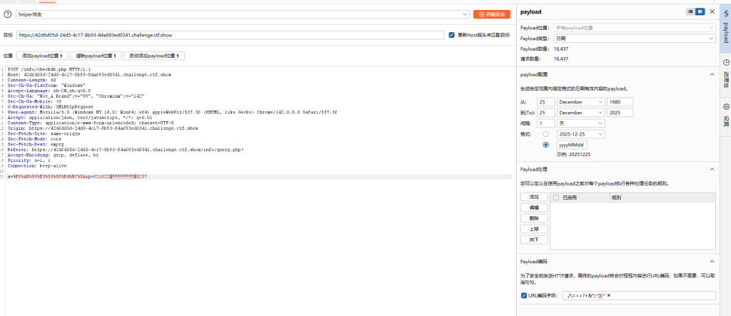 4、发送到Intruder,把隐藏的出生日期添加爆破,爆破模式为狙击手模式payload的类型为dates,payload配置格式为yyyyMMdd,日期要大范围