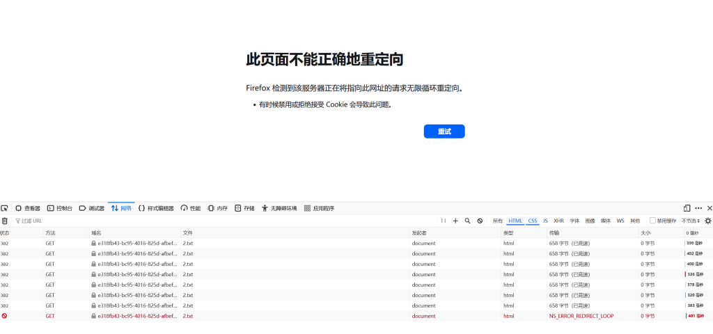 1、打开页面,尝试在url中输入内容找到flag位置,发现一直循环重定向失败,页面报错,状态码为302
