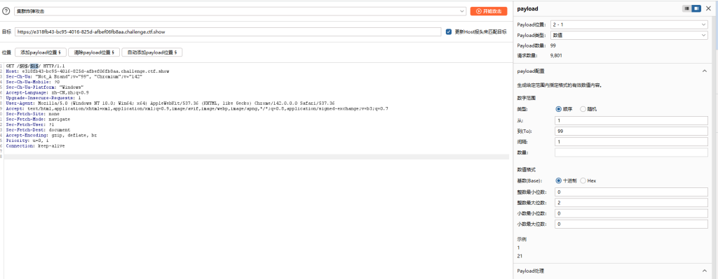 2、利用bp爆破,先抓包发送到Intruder,将根目录添加爆破,去掉2.txt,爆破模式为集群炸弹攻击,payload类型为数值,1-0的配置为payload type:numbers from 1 to 99 step 1,2-1的配置payload type:numbers from 1 to 99 step 1